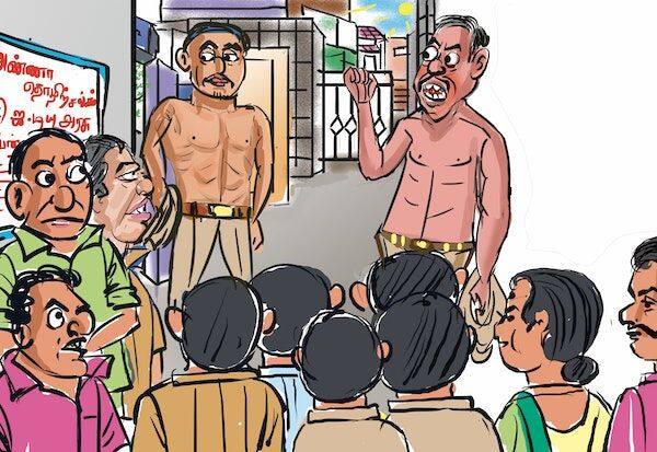 அப்போது, இரண்டு தொழிலாளர்கள் சட்டையை கழற்றி, அரை நிர்வாணமாக போராட்டத்தில் ஈடுபட்டனர். மற்ற தொழிலாளர்களையும் சட்டையை கழற்றுமாறு சொல்ல, பலரும் யோசித்து அமைதி காத்தனர்.